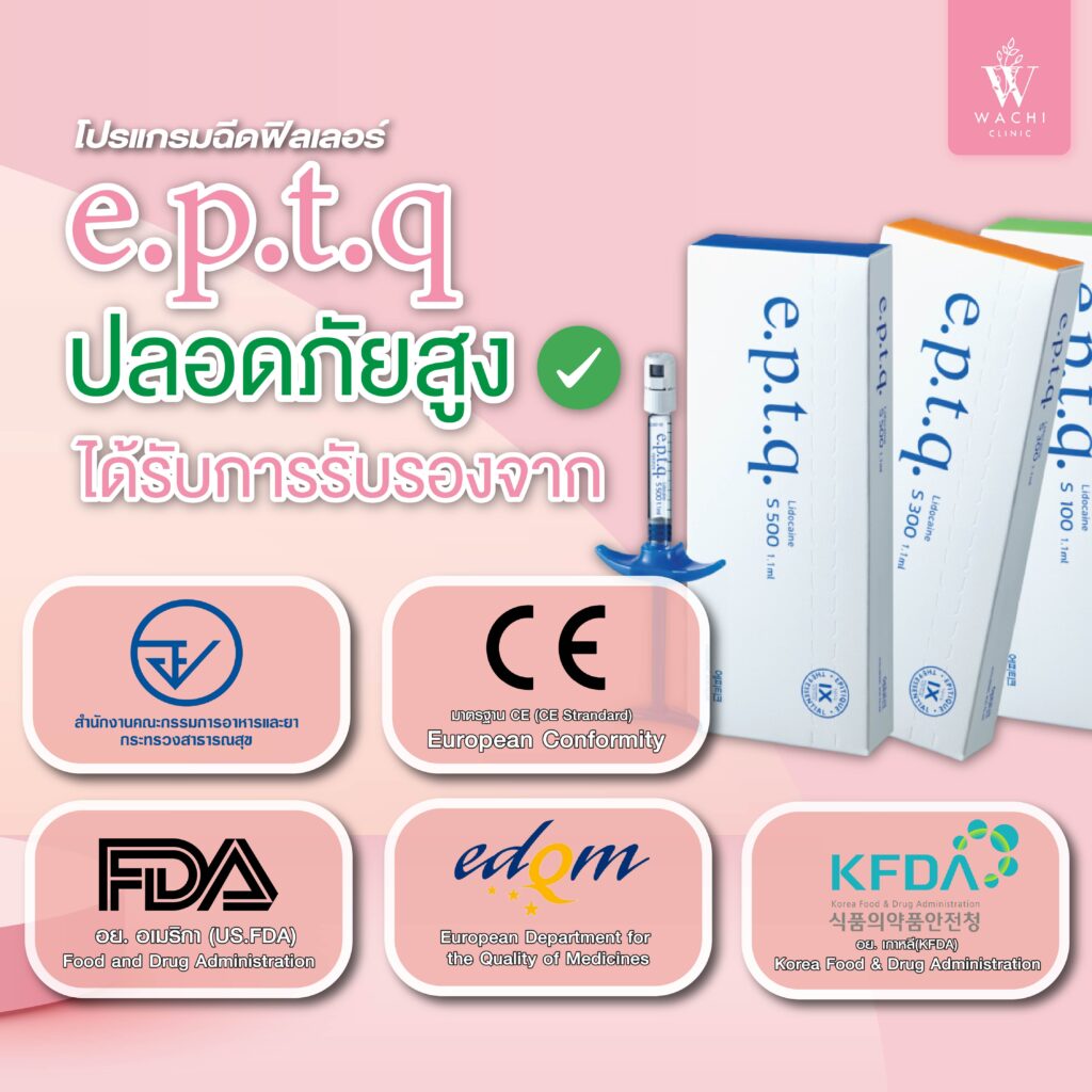 ฟิลเลอร์ e.p.t.q. มีความปลอดภัยสูงได้รับการรับรองจากอย.ไทย (TH FDA), CE Mark อย.เกาหลี (KFDA), EDQM และ อย.อเมริกา (US FDA)