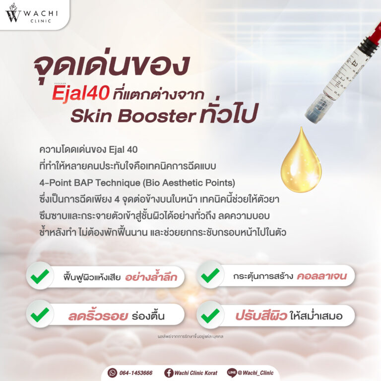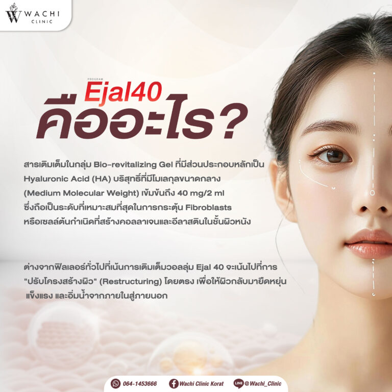 เมื่ออายุเพิ่มขึ้น ผิวพรรณเริ่มสูญเสียความชุ่มชื้น คอลลาเจน และอีลาสติน ส่งผลให้เกิดปัญหาผิวแห้งกร้าน ริ้วรอยร่องตื้น และความหย่อนคล้อย หากคุณกำลังมองหาตัวช่วยที่สามารถฟื้นฟูผิวได้อย่างล้ำลึกและเห็นผลรวดเร็ว Ejal 40 คือนวัตกรรม Skin Booster รุ่นใหม่ล่าสุดที่กำลังได้รับความนิยมอย่างสูงในขณะนี้ ซึ่งที่ Wachi Clinic คลินิกเสริมความงามโคราช เราพร้อมให้บริการเพื่อคืนความอ่อนเยาว์ให้กับคุณ