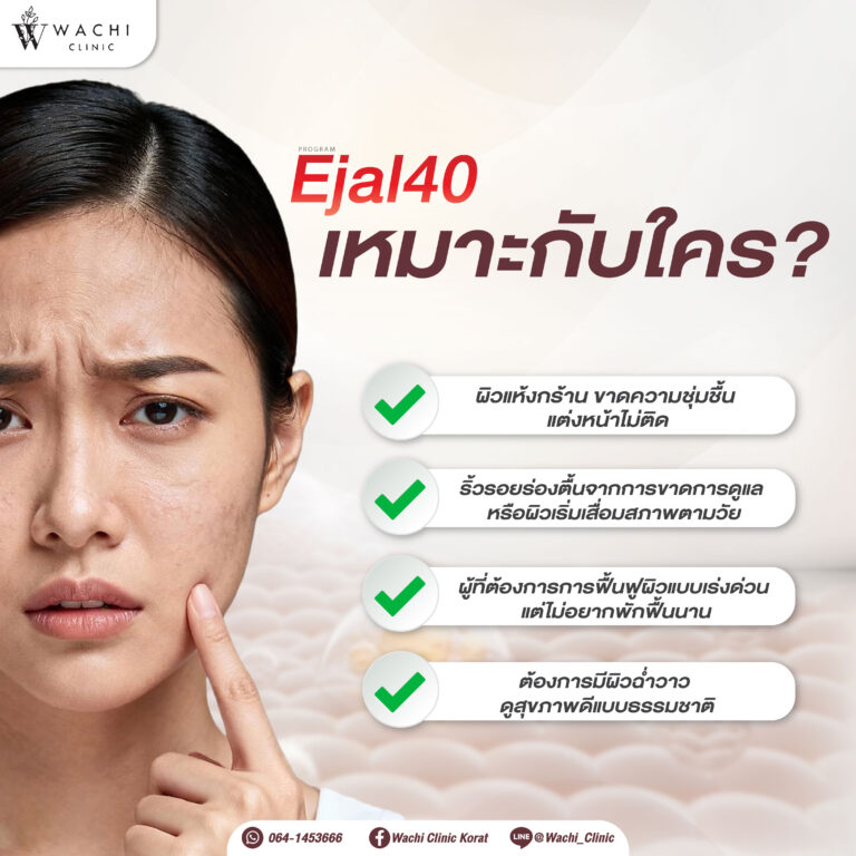 Ejal 40 คือทางลัดสู่ผิวสวยสุขภาพดีที่ตอบโจทย์คนยุคใหม่ ช่วยทั้งเรื่องความชุ่มชื้น การลดริ้วรอย และการยกกระชับในหนึ่งเดียว หากคุณต้องการคืนความสดใสให้กับผิวหน้าอย่างมั่นใจ เข้ามาปรึกษาได้ที่ Wachi Clinic