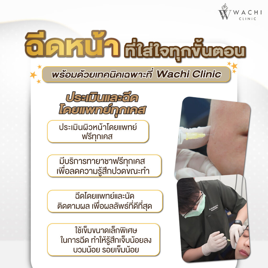 เห็นผลเร็วและชัดเจน เพราะสารบำรุงถูกส่งเข้าสู่ชั้นผิวโดยตรง ทำให้ผิวอิ่มฟูและกระชับภายใน 1–2 สัปดาห์ ฟื้นฟูผิวตรงจุด ลดริ้วรอยเล็กๆ กระชับรูขุมขน ปรับสีผิวให้เรียบเนียนและกระจ่างใส การฉีดกระตุ้นคอลลาเจนปลอดภัย ใช้สารบำรุงที่กระตุ้นคอลลาเจนจากร่างกาย หรือวิตามินและสารสกัดธรรมชาติ หากฉีดโดยแพทย์ผู้เชี่ยวชาญ และใช้ตัวยาแท้ผ่าน อย. และผลลัพธ์อยู่ได้นาน เนื่องจากคอลลาเจนที่สร้างขึ้นจากร่างกายช่วยให้ผิวดูอิ่มฟู 6–12 เดือน ขึ้นอยู่กับสูตรและสภาพผิว ที่ วาชิคลินิก ประเมินปัญหาโดยแพทย์ก่อนทำทุกครั้งและทุกขั้นตอนอยู่ภายใต้การดูแลของแพทย์