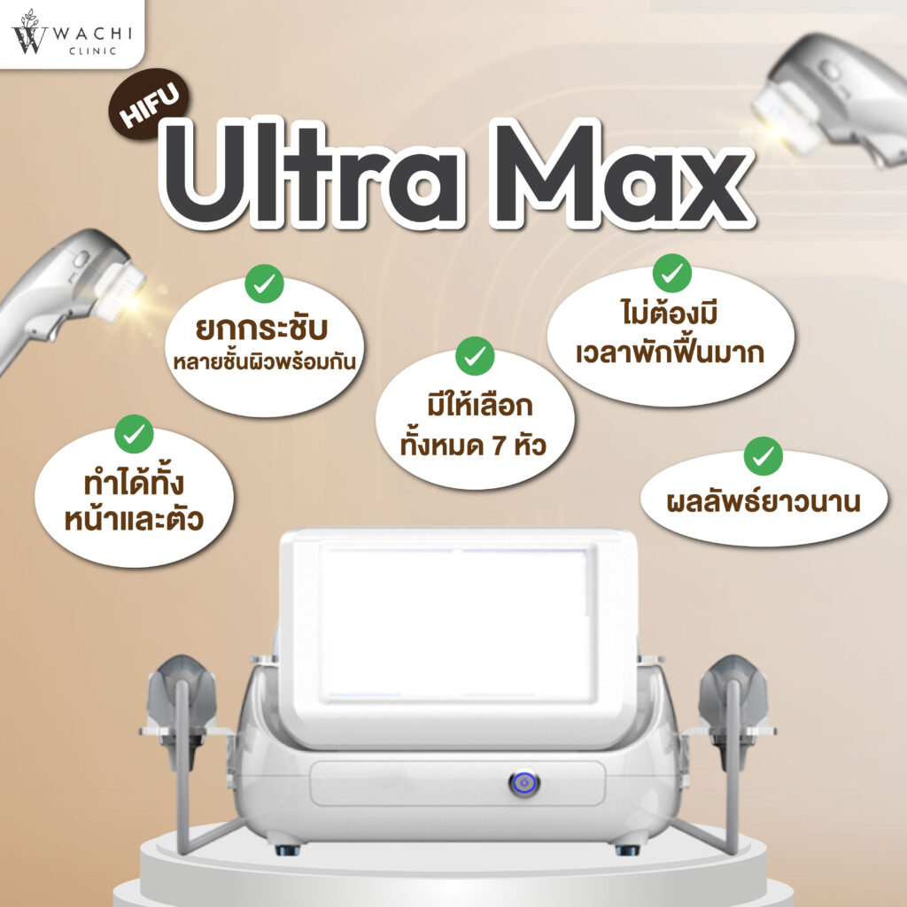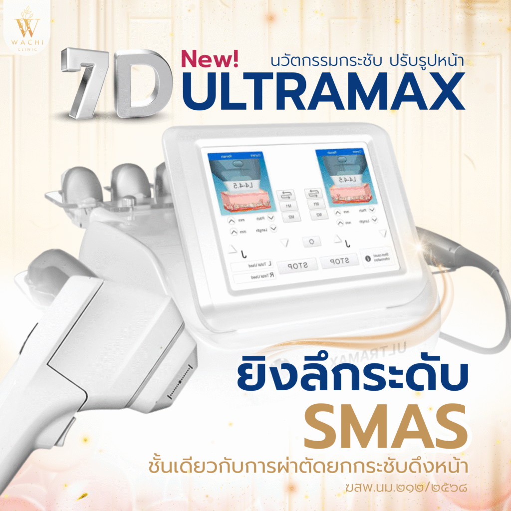 7D Ultramax คือ เครื่อง High Intensity Focus Ultrasound (HIFU) ที่ใช้สำหรับยกกระชับผิว กระตุ้นคอลลาเจน ช่วยลดริ้วรอยและทำให้ผิวเต่งตึง ทำงานโดยใช้การยิงคลื่นอัลตราซาวด์เข้าไปยังชั้นใต้ผิวหนังให้เกิดความร้อน ทำให้เนื้อเยื่อมีการหดตัวและทำให้ผิวชั้นบนยกกระชับขึ้น โดยไม่ต้องผ่าตัด เครื่อง Ultramax7D สามารถส่งพลังงานลงลึกได้ถึงชั้น SMAS ที่เป็นชั้นสำหรับผ่าตัดศัลยกรรมดึงหน้า ขณะทำพลังงานจะคงที่ สม่ำเสมอ ไม่ส่งผลกระทบต่อผิวชั้นบน มีความปลอดภัยสูง หลังทำไม่มีแผล สามารถใช้หน้าได้ตามปกติ ไม่ต้องพักฟื้น